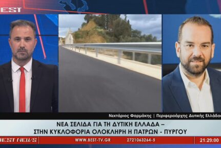 Νέα αναπτυξιακή σελίδα άνοιξε στην Περιφέρεια Δυτικής Ελλάδας με την ολοκλήρωση του αυτοκινητόδρομου Πάτρα Πύργος. Ο Περιφερειάρχης Δυτικής Ελλάδας Νεκτάριος Φαρμάκης μιλώντας στο Κεντρικό Δελτίο της τηλεόρασης BEST τονίζοντας «Οι κάτοικοι ακόμη δεν μπορούν να το πιστέψουν. Είναι πανηγυρικό συναίσθημα