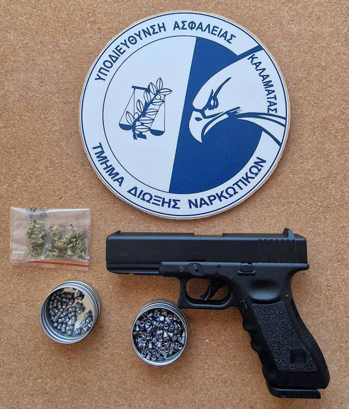 - μικροποσότητες κάνναβης, -2- ναρκωτικά δισκία, -1- αεροβόλο πιστόλι μετά γεμιστήρα και -293- μεταλλικά σφαιρίδια, στη Μεσσηνία.