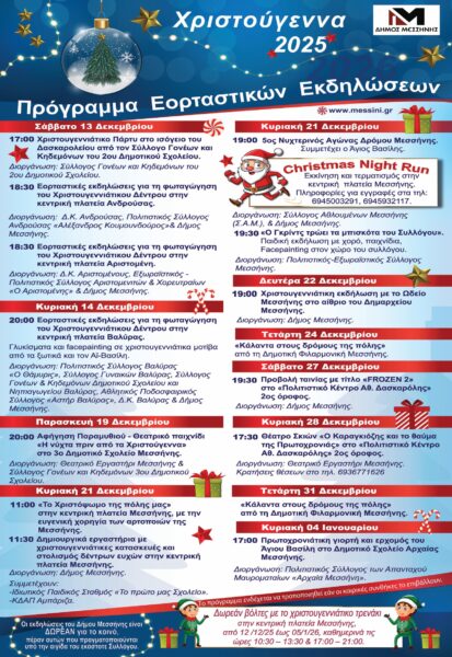 19:00 5ος Νυχτερινός Αγώνας Δρόμου Μεσσήνης “Christmas Night Run”. Συμμετέχει ο Άγιος Βασίλης