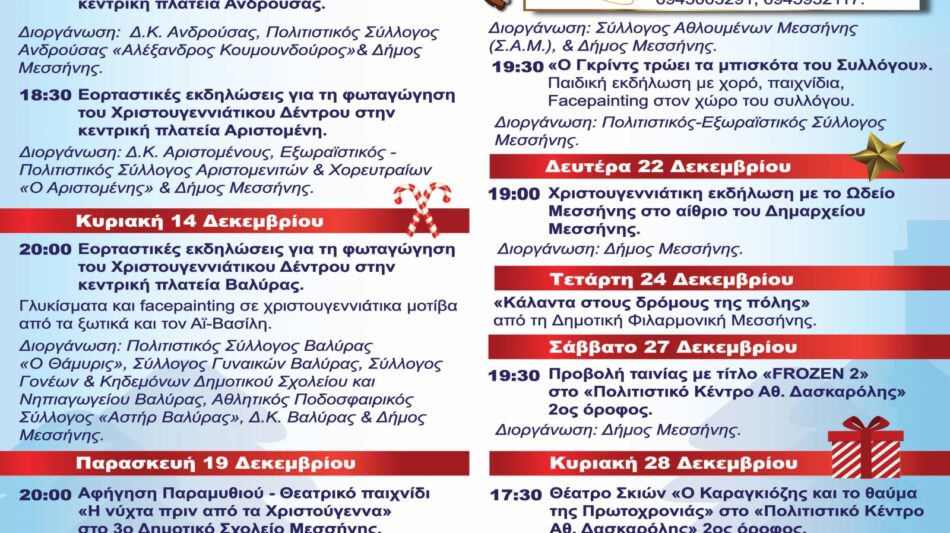 11:30 Δημιουργικά εργαστήρια με χριστουγεννιάτικες κατασκευές και στολισμός δέντρων ευχών στην κεντρική πλατεία Μεσσήνης.