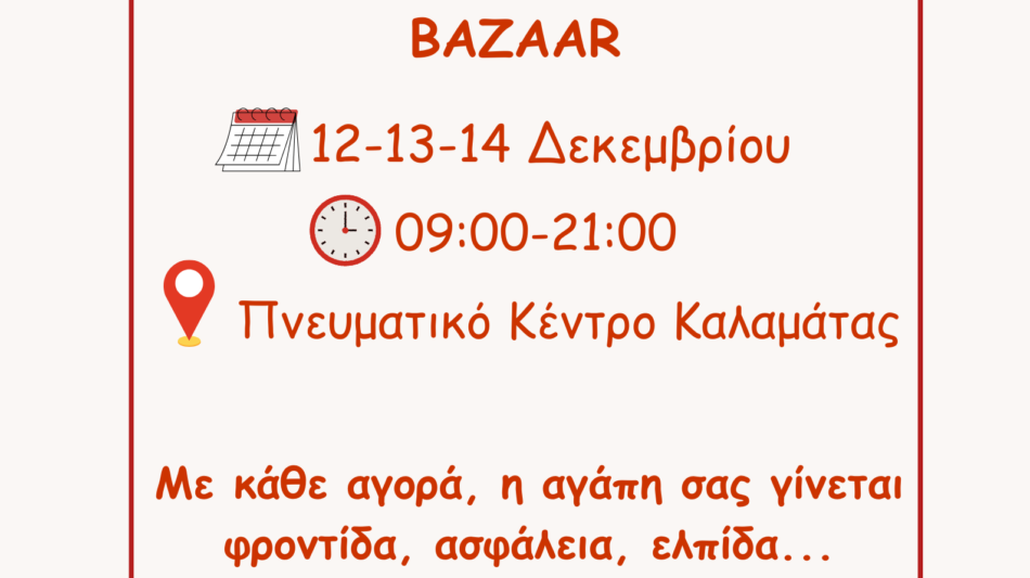 Το Κέντρο Στήριξης Παιδιού και Οικογένειας και το Κέντρο Επαγγελματικής και Οικογενειακής Υποστήριξης των Παιδικών Χωριών SOS στην Καλαμάτα, σε συνεργασία με την Ομάδα Στήριξης, διοργανώνουν Χριστουγεννιάτικο Bazaar για την υποστήριξη του έργου τους στο Πνευματικό Κέντρο Καλαμάτας στις 12, 13, & 14 Δεκεμβρίου 2025, ώρες 9.00 – 21.00.