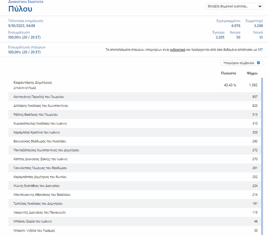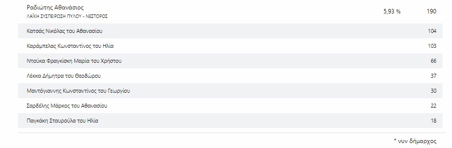 Με την ενσωμάτωση να έχει ολοκληρωθεί στα 81 εκλογικά τμήματα του δήμου Πύλου Νέστορος στη «μάχη» των σταυρών προηγούνται, ανά συνδυασμοί, οι δημοτικοί σύμβουλοι: