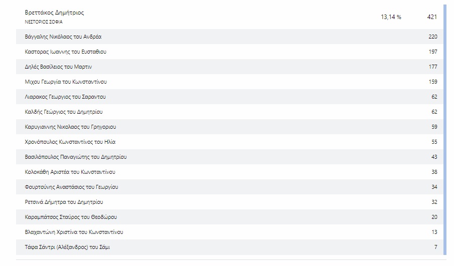 Τρίτος ο Δημήτρης Βρεττάκος με την «Νεστόριο Σοφία» με 14,10% και 1.833 ψήφους και τέταρτος ο Αθανάσιος Ραδιώτης της Λαϊκής Συσπείρωσης με 4,63% ο οποίος έλαβε 602 ψήφους.