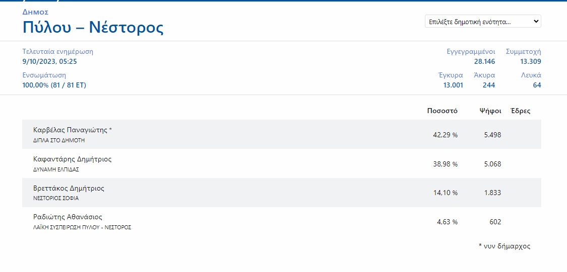 Η εκλογική αναμέτρηση για το δήμο Ποσοστό συνεχίζεται και τη δεύτερη Κυριακή, 15 Οκτωβρίου, αφού μετά από αρκετές ανατροπές ο νυν δήμαρχος Παναγιώτης Καρβέλας συγκέντρωση το 42,29% των ψήφων στο δήμο Πύλου Νέστορος.