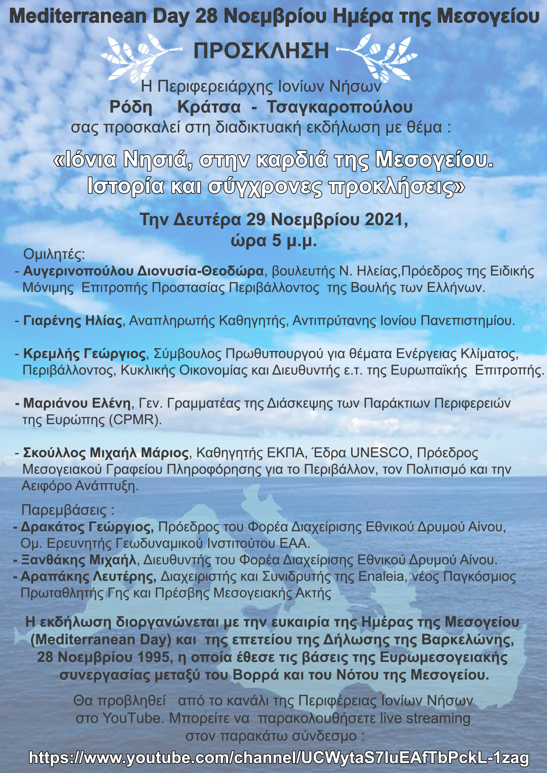Η εκδήλωση θα προβληθεί ζωντανά από το κανάλι της Περιφέρειας Ιονίων Νήσων στο YouTube στον εξής σύνδεσμο (link): https://www.youtube.com/channel/UCWytaS7IuEAfTbPckL-1zag