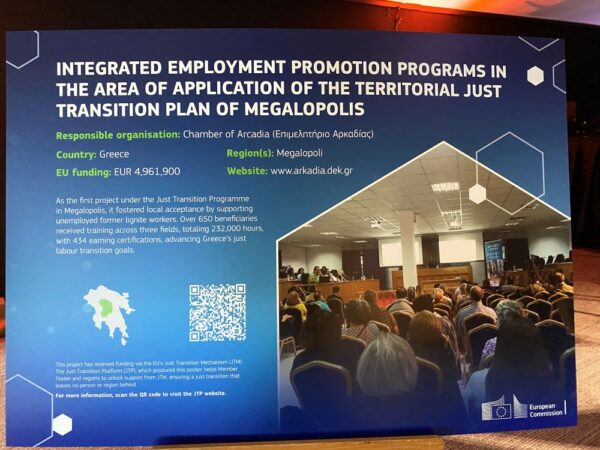 Μια ιδιαίτερα σημαντική διάκριση για τα Επιμελητήρια Αρκαδίας και Μεσσηνίας αποτέλεσε η παρουσίαση / προβολή του έργου των «Ολοκληρωμένων Προγραμμάτων προώθησης στην απασχόληση στην περιοχή εφαρμογής του Εδαφικού Σχεδίου Δίκαιης Μετάβασης Μεγαλόπολης» ανάμεσα στα εννέα (9) Ευρωπαϊκά έργα που επιλέχθηκαν στο πλαίσιο του 5ου Ετήσιου Συνεδρίου της Πλατφόρμας Δίκαιης Μετάβασης, που διοργάνωσε η Γενική Διεύθυνση Περιφερειακής και Αστικής Πολιτικής της Ευρωπαϊκής Επιτροπής στις Βρυξέλλες από τις 21 έως τις 23 Οκτωβρίου 2025.