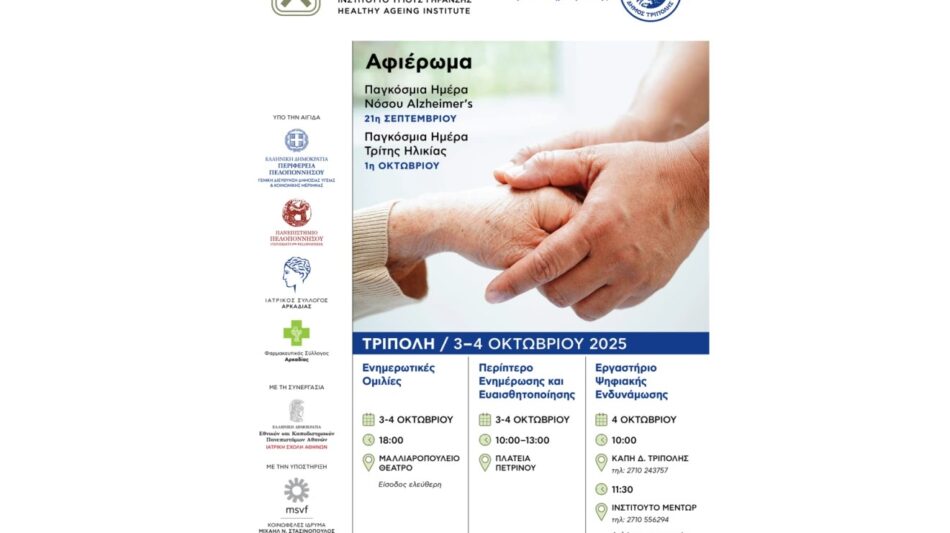 Με αφορμή την Παγκόσμια Ημέρα Νόσου Alzheimer’s (21 Σεπτεμβρίου) και την Παγκόσμια Ημέρα Τρίτης Ηλικίας (1 Οκτωβρίου), ο Δήμος Τρίπολης διοργανώνει ένα διήμερο αφιέρωμα αφιερωμένο στη φροντίδα, την ενημέρωση και την ενδυνάμωση των ηλικιωμένων. Η εκδήλωση θα πραγματοποιηθεί στις 3 και 4 Οκτωβρίου 2025 και στοχεύει στην ευαισθητοποίηση του κοινού γύρω από θέματα υγείας, μνήμης, πρόληψης και ψηφιακής ένταξης της Τρίτης Ηλικίας.