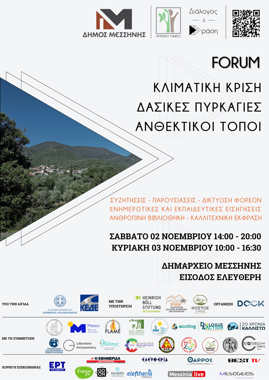 Πόσο ανθεκτικές μπορούν να είναι οι τοπικές κοινωνίες; Η έλευση της κλιματικής κρίσης και οι επιπτώσεις της είναι πλέον ορατές όπως είναι και οι κίνδυνοι που ελλοχεύουν και αναδεικνύνουν περισσότερο από ποτέ άλλοτε την αναγκαίοτητα αποφάσεων και δράσεων πριν να είναι αργά… Ένα διήμερο ουσιαστικού διαλόγου αναμένεται στη Μεσσήνη στο επίκεντρο φόρουμ με θέμα: “Κλιματική κρίση, δασικές πυρκαγιές, ανθεκτικοί τόποι” που διοργανώνουν η Κοιν.Σεπ DOCK και ο δήμος και τελεί υπό την αιγίδα της Περιφέρειας Πελοποννήσου και της ΚΕΔΕ.