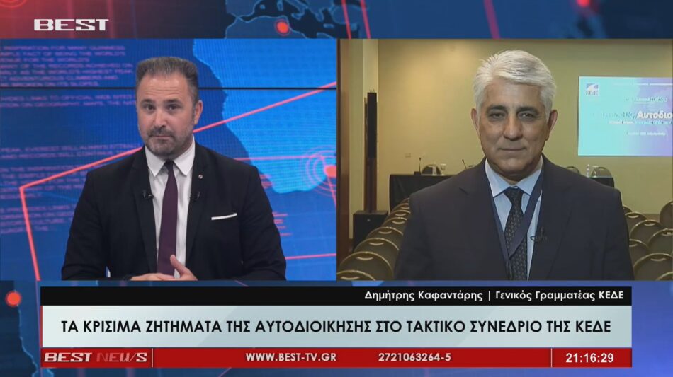 Τις προτεραιότητες και τις προκλήσεις που αντιμετωπίζει σήμερα η τοπική αυτοδιοίκηση πρώτου βαθμού θέτει στο προσκήνιο η ΚΕΔΕ μέσω του συνεδρίου της που πραγματοποιείται στην Αλεξανδρούπολη. Από εκεί ο Δημήτρης Καφαντάρης, με παρέμβασή του στο κεντρικό δελτίο ειδήσεων του BEST τόνισε πως η αυτοδιοίκηση στο σύνολό της είναι έτοιμη για διάλογοι αλλά και αγώνες εφόσον χρειαστεί για την διεκδίκηση των πορτών και των μέσων που θα επιτρέψει «να ασκούμε καλύτερα τις αρμοδιότητές μας κάνουμε καλύτερη πολιτική για τον τόπο μας».