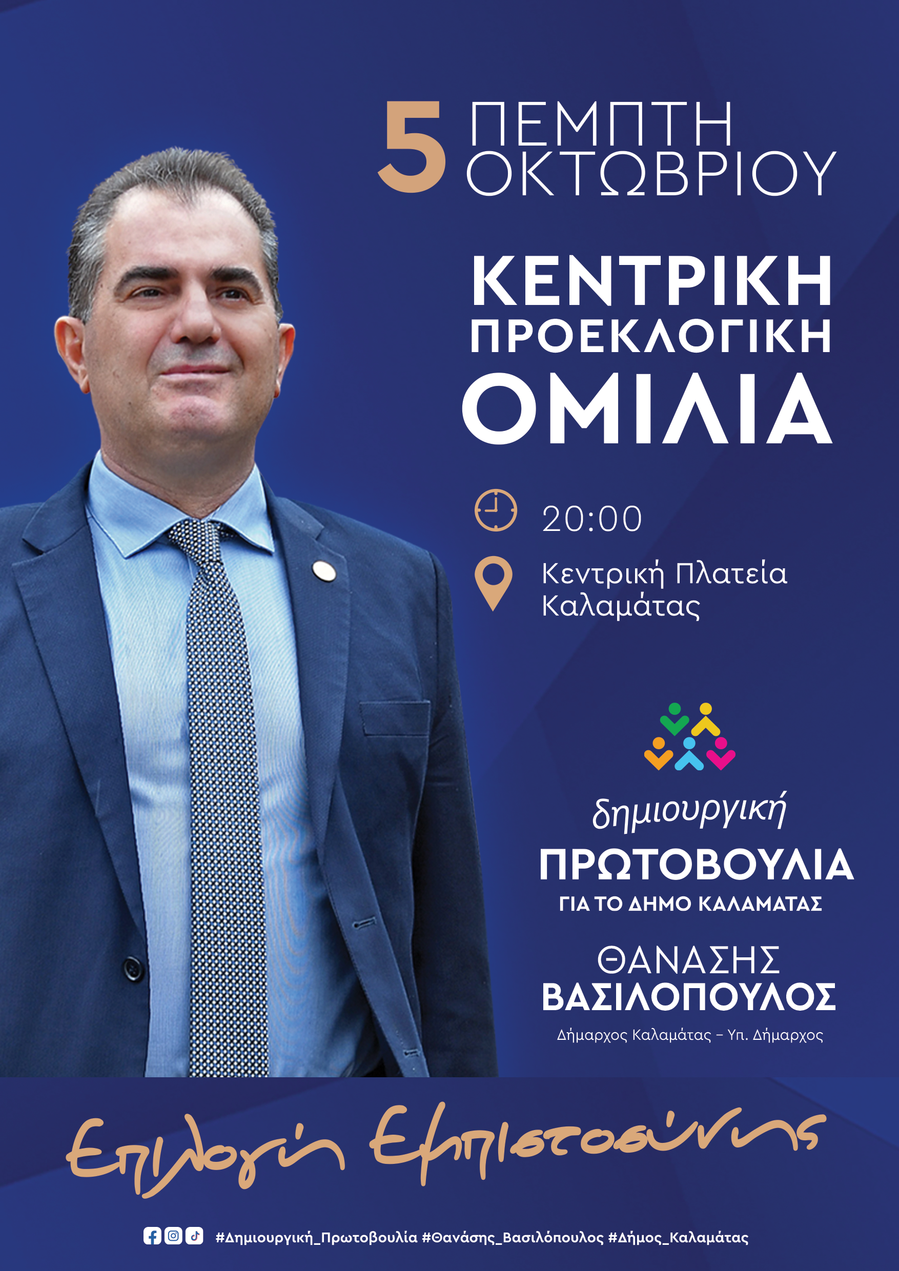 Την Πέμπτη 5 Οκτωβρίου 2023 και ώρα 20:00 η «Δημιουργική Πρωτοβουλία για το Δήμο Καλαμάτας» καλεί τις δημότισσες και τους δημότες του Δήμου Καλαμάτας στην κεντρική προεκλογική ομιλία του Δημάρχου Καλαμάτας και επικεφαλής του συνδυασμού της «Δημιουργικής Πρωτοβουλίας για το Δήμο Καλαμάτας» Θανάση Βασιλόπουλου.