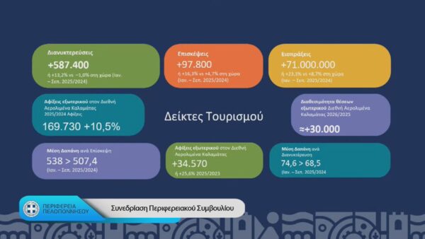 Θετικά αποτιμάται και η πορεία του τουρισμού στην Πελοπόννησο, με αυξημένους ρυθμούς σε σχέση με τον εθνικό μέσο όρο, τόσο στις διανυκτερεύσεις όσο και στα έσοδα, ενώ το αεροδρόμιο της Καλαμάτας καταγράφει διαδοχικά ρεκόρ αφίξεων.