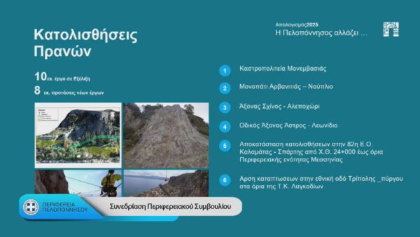 Παράλληλα, προχωρούν έργα συντήρησης και βελτίωσης του οδικού δικτύου σε όλες τις Περιφερειακές Ενότητες, με παρεμβάσεις που, όπως σημειώθηκε, εκκρεμούσαν για χρόνια. Ενδεικτικά αναφέρθηκαν έργα όπως ο δρόμος στο Φενεό Κορινθίας, ο Δρόμος των Αρχαιοτήτων στην Αργολίδα, ο άξονας Γύθειο – Αρεόπολη και η νέα γέφυρα στη Σκάλα Λακωνίας.