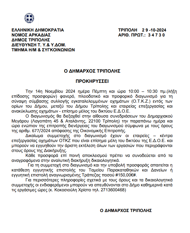 Προθεσμία μέχρι τις 14 Νοεμβρίου έχουν οι ενδιαφερόμενοι να συμμετέχουν στον διαγωνισμό για τη σύναψη σύμβασης συλλογής εγκαταλελειμμένων οχημάτων στο δήμο Τρίπολης, σύμφωνα με την σχετική ενημέρωση.