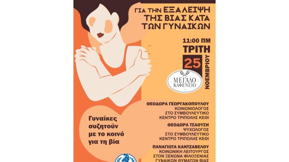 Ο Δήμος Τρίπολης, τιμώντας τη Διεθνή Ημέρα για την Εξάλειψη της Βίας κατά των Γυναικών, διοργανώνει την Τρίτη 25 Νοεμβρίου, στις 11:00 π.μ., μια ανοικτή συζήτηση στο «Μεγάλο Καφενείο», με κεντρικό μήνυμα «Γυναίκες συζητούν με το κοινό για τη βία».