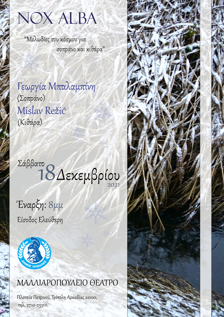 Συναυλία με μελωδίες του κόσμου για σοπράνο και κιθάρα θα γίνει το Σάββατο 18 Δεκεμβρίου 2021 στις 8.00 μ.μ. στο Μαλλιαροπούλειο Θέατρο Τρίπολης.
