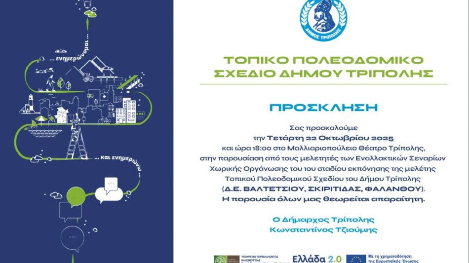 Η εκδήλωση απευθύνεται σε δημότες και φορείς, για την υπό εκπόνηση μελέτη του Τοπικού Πολεοδομικού Σχεδίου που διοργανώνει ο Δήμος Τρίπολης την Τετάρτη 22 Οκτωβρίου 2025 και ώρα: 18.00 στο Μαλλιαροπούλειο Θέατρο Τρίπολης.