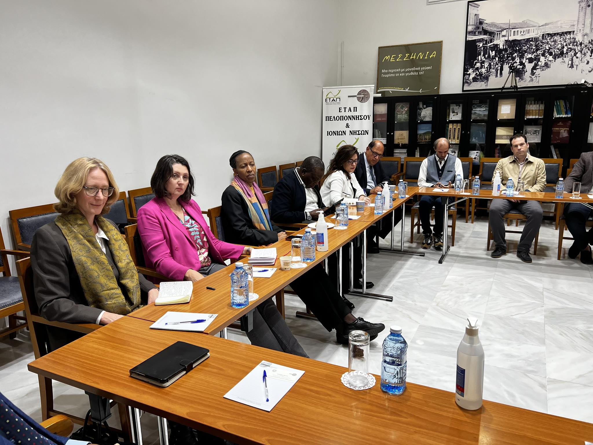 Επίσκεψη εργασίας πραγματοποιήθηκε σήμερα Παρασκευή 10 Νοεμβρίου 2023 στο Επιμελητήριο Μεσσηνίας, παρουσία της A.E. Πρέσβειρας της Δημοκρατίας του Παναμά Mrs. Julie Lymberopulos, με την συμμετοχή των Εξοχότατων κ.κ. Πρέσβεων της Πορτογαλίας Mrs. Helena Paiva, Αλβανίας Mrs. Luela Hajdaraga, Κούβας Mr. Aramis Fuente Hernández, Σλοβακίας Mrs. Marcela Hanusova, Σλοβενίας Mrs. Tamara Weingerl Požar, Αυστρίας Mrs. Gerda Vogl, Μεξικό Mr. Alejandro García Moreno Elizondo και Νότιας Αφρικής Mrs. Lindiwe Gail MsenganaNdlela. Τους υποδέχθηκε ο Πρόεδρος κ. Βαγγέλης Ξυγκώρος, μέλη της Διοίκησης του Επιμελητηρίου, του Εμπορικού Συλλόγου Καλαμάτας, των Συλλογών Εστίασης Μεσσηνίας και Καλαμάτας.