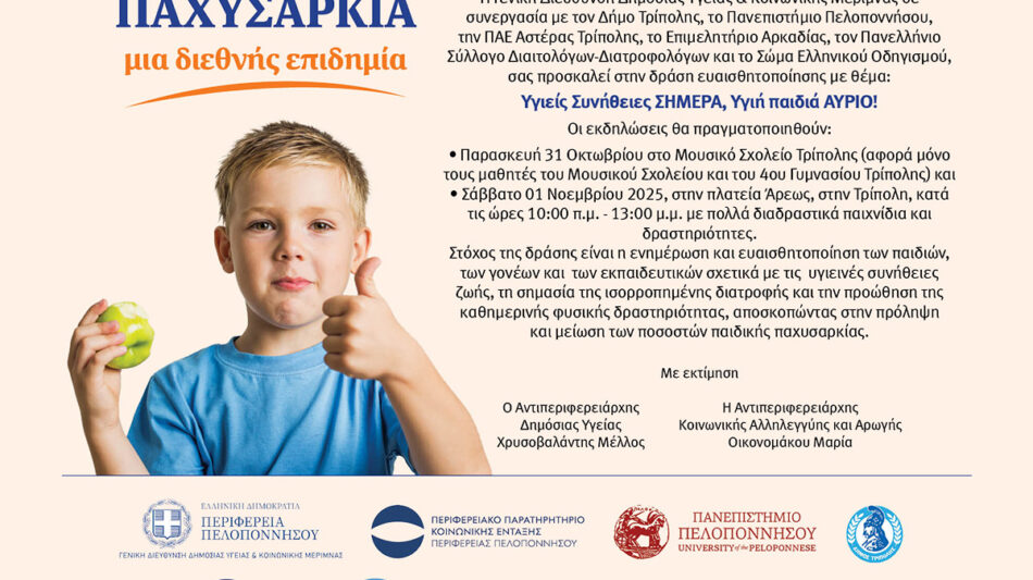 Η Γενική Διεύθυνση Δημόσιας Υγείας & Κοινωνικής Μέριμνας σε συνεργασία με τον Δήμο Τρίπολης, το Πανεπιστήμιο Πελοποννήσου, την ΠΑΕ Αστέρας Τρίπολης, το Επιμελητήριο Αρκαδίας, τον Πανελλήνιο Σύλλογο Διαιτολόγων-Διατροφολόγων και το Σώμα Ελληνικού Οδηγισμού, σας προσκαλεί στην δράση ευαισθητοποίησης με θέμα: Υγιείς Συνήθειες ΣΗΜΕΡΑ, Υγιή παιδιά ΑΥΡΙΟ!