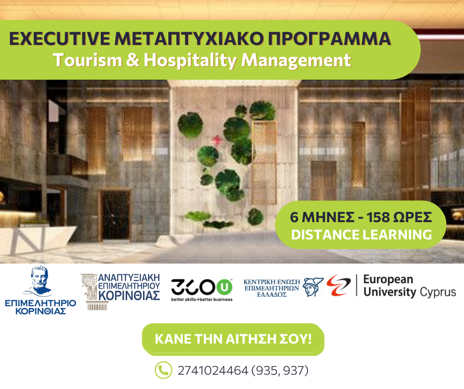 Το Επιμελητήριο Κορινθίας, η Αναπτυξιακή εταιρεία του η 360U Better Skills – Better Business αναγνωρίζοντας την αυξανόμενη ανάγκη για εκπαίδευση και αναγνώριση στο χώρο της Διοίκησης Τουριστικών Επιχειρήσεων & Φιλοξενίας παρουσιάζουν, με την υποστήριξη της Κεντρικής Ένωσης Επιμελητηρίων Ελλάδος (ΚΕΕΕ) και σε συνεργασία με το Ευρωπαϊκό Πανεπιστήμιο Κύπρου, το Executive Μεταπτυχιακό Πρόγραμμα Tourism & Hospitality Management.