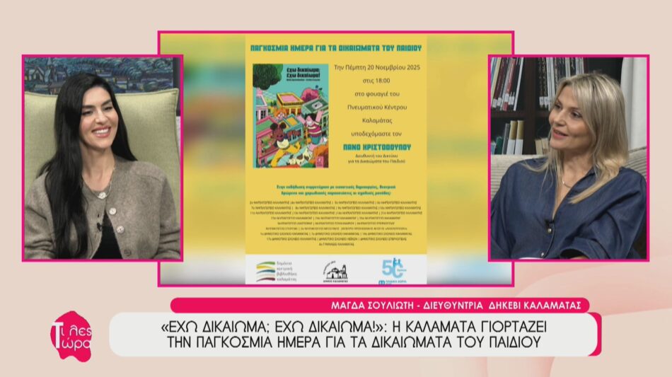Η Διευθύντρια της Δημόσιας Κεντρικής Βιβλιοθήκης Καλαμάτας, Μάγδα Σουλιώτη, φιλοξενήθηκε στην εκπομπή «Τι λες Τώρα με την Αναστασία Μάντζαρη» και μας μίλησε για την εξαιρετικά ενδιαφέρουσα εκδήλωση που διοργανώνεται με αφορμή την Παγκόσμια Ημέρα για τα Δικαιώματα του Παιδιού. Όλες οι λεπτομέρειες για τη μεγάλη γιορτή της Πέμπτης 20 Νοεμβρίου, τον ρόλο του βιβλίου «Έχω δικαίωμα; Έχω δικαίωμα!» και τη δυναμική συμμετοχή των σχολείων της πόλης στον διάλογο για τον σεβασμό και την αγάπη προς κάθε παιδί.
