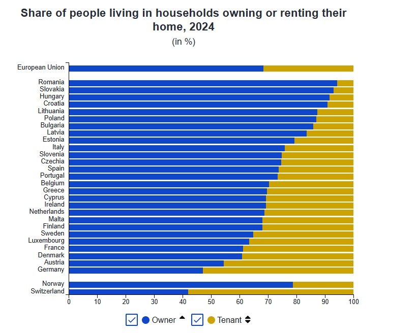 Η κατανομή του πληθυσμού ως προς το ιδιοκτησιακό καθεστώς διαφέρει σημαντικά μεταξύ των χωρών της ΕΕ. Το 2024, το 68% του πληθυσμού ήταν ιδιοκτήτες της κατοικίας τους, ενώ το 32% ζούσε σε ενοίκιο.