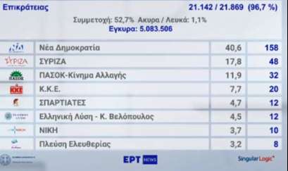 - Νέα Δημοκρατία: 40,56%, 158 έδρες