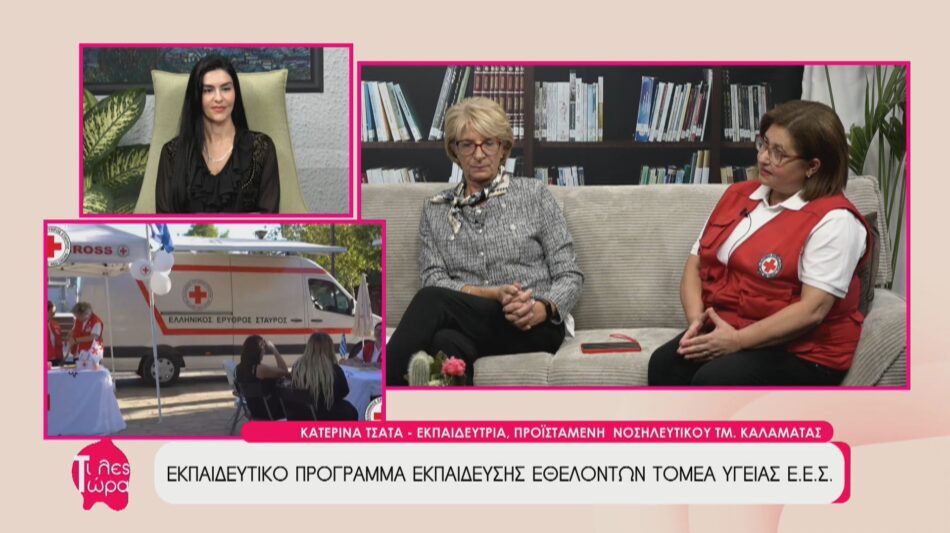 Ε.Ε.Σ. και η Κατερίνα Τσατά , Εκπαιδεύτρια – Προϊσταμένη Νοσηλευτικού Τμήματος Καλαμάτας, καλεσμένες στην εκπομπή ‘’Τι Λες Τώρα’’ με την Αναστασία Μάντζαρη, μίλησαν για το νέο Εκπαιδευτικό Πρόγραμμα Εκπαίδευσης Εθελοντών Τομέα Υγείας, ένα πρόγραμμα που καλεί τους πολίτες να γίνουν ενεργό κομμάτι στο ανθρωπιστικό έργο και να προσφέρουν φροντίδα και χαμόγελο εκεί που υπάρχει ανάγκη.