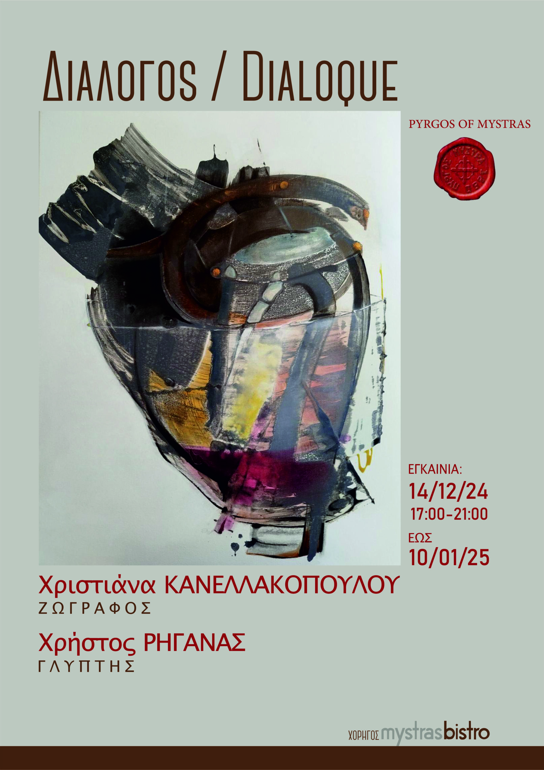 Έκθεση Γλυπτικής και ζωγραφικής θα πραγματοποιήσουν 14/12/2024 – 10/1/2025 ο Χρήστος Ρηγανάς και η Χριστιάνα Κανελλακοπούλου. Έχει τον τίτλο «Διάλογος», ένας διάλογος φόρμας και χρώματος ανάμεσα σε επιλεγμένα έργα των διακεκριμένων καλλιτεχνών που θα φιλοξενηθούν στον Πύργο Μυστρά στην πόλη του Μυστρά, μια ενδιαφερουσα συνέχεια της συνεργασίας τους στην Καρδαμύλη ανανεωμένη και εμπλουτισμένη με νέα έργα. Τα εγκαίνια θα πραγματοποιηθούν 14/12/2024 και ώρα 17.00 -21.00 και η έκθεση θα είναι επισκέψιμη καθημερινά .