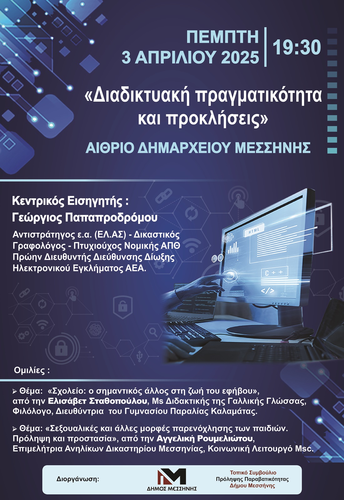 Διευρυμένη ενημέρωση για την διαδικτυακή πραγματικότητα και τους κινδύνους του διαδικτύου οργανώνει ο Δήμος Μεσσήνης σε συνεργασία με το Τοπικό Συμβούλιο Πρόληψης Παραβατικότητας. Ειδικότερα την Πέμπτη 3 Απριλίου θα γίνουν ενημερώσεις μαθητών και εκπαιδευτικών στο 1ο και 2ο Γυμνάσιο Μεσσήνης και την Παρασκευή 4 Απριλίου στο Γενικό Λύκειο Μεσσήνης και το ΕΠΑΛ.