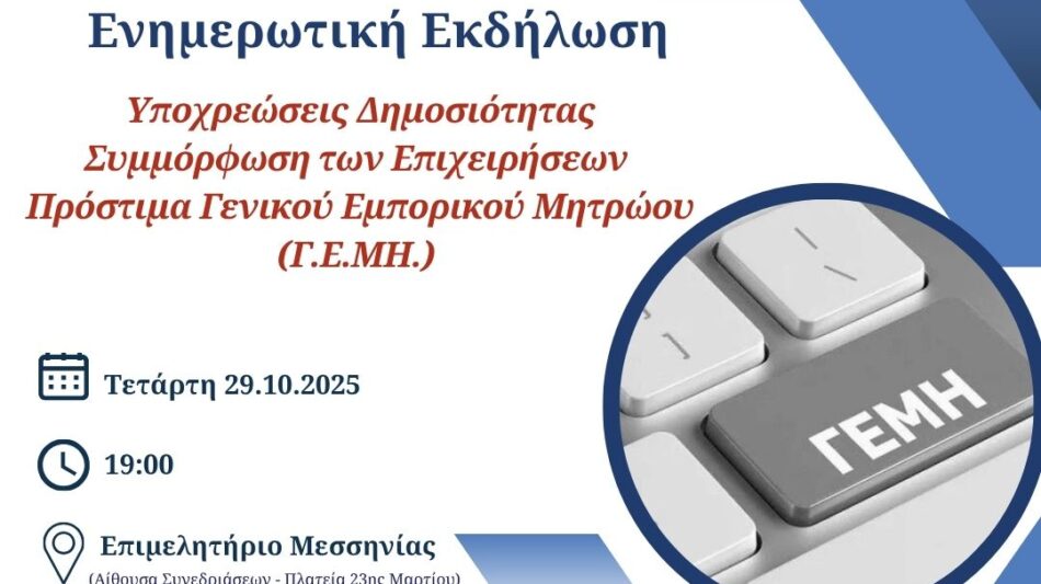 Το Επιμελητήριο Μεσσηνίας διοργανώνει ενημερωτική εκδήλωση με θέμα: “ΥΠΟΧΡΕΩΣΕΙΣ ΔΗΜΟΣΙΟΤΗΤΑΣ – ΣΥΜΜΟΡΦΩΣΗ ΤΩΝ ΕΠΙΧΕΙΡΗΣΕΩΝ ΠΡΟΣΤΙΜΑ ΓΕΝΙΚΟΥ ΕΜΠΟΡΙΚΟΥ ΜΗΤΡΩΟΥ (Γ.Ε.ΜΗ.)” την Τετάρτη 29.10.2025 και ώρα 19:00, στην αίθουσα συνεδριάσεων του Επιμελητηρίου Μεσσηνίας.