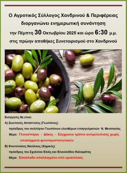 Ο Αγροτικός Σύλλογος Χανδρινού & Περιφέρειας διοργανώνει ενημερωτική συνάντηση την Πέμπτη 30 Οκτωβρίου 2025 και ώρα 6:30 μμ στις αποθήκες του συνεταιρισμού στο χανδρινού, με θέμα ελαιόλαδο απαλλαγμένο από ορυκτέλαια, δάκος, γλοιοσπόριο, σύγχρονοι τρόποι αντιμετώπιση χωρίς υπολείμματα φυτοπροστατευτικών.