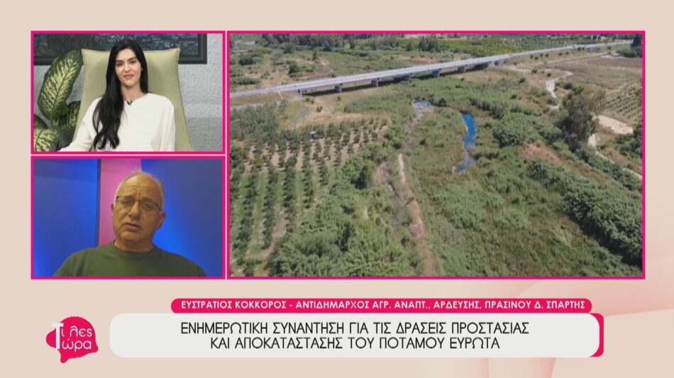 Ο Ευστράτιος Kοκκορός Αντιδήμαρχος Αγροτικής Ανάπτυξης, Άρδευσης, Πράσινου Δήμου Σπάρτης , καλεσμένος στην εκπομπή ‘’Τι Λες Τώρα’’ με την Αναστασία Μάντζαρη, μίλησε για την ενημερωτική συνάντηση που αφορά το έργο «Δράσεις Προστασίας και Αποκατάστασης του ποταμού Ευρώτα » και για την αναβάθμιση του πρασίνου στην Σπάρτη.