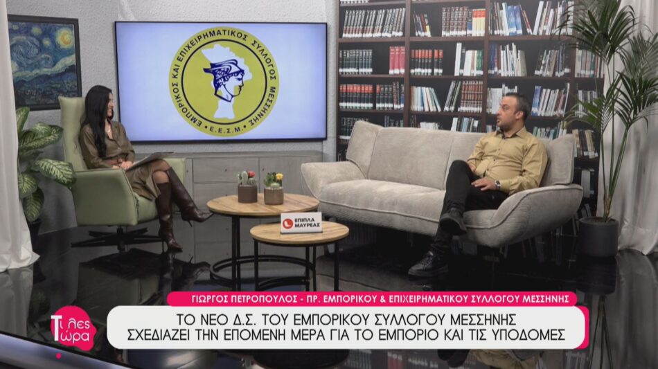Ο Πρόεδρος του Εμπορικού & Επιχειρηματικού Συλλόγου Μεσσήνης, Γιώργος Πετρόπουλος, καλεσμένος στην εκπομπή «Τι Λες Τώρα» με την Αναστασία Μάντζαρη, μίλησε για τη νέα εντολή εμπιστοσύνης και τους στόχους του νέου Δ.Σ. Ανέλυσε την τρέχουσα κατάσταση της αγοράς, τις προκλήσεις που αντιμετωπίζει η πόλη σε θέματα υποδομών και χρηματοδότησης, ενώ τόνισε τη σταθερή στήριξη του Συλλόγου στους αγρότες και κτηνοτρόφους της περιοχής εν μέσω των πρόσφατων κινητοποιήσεων.