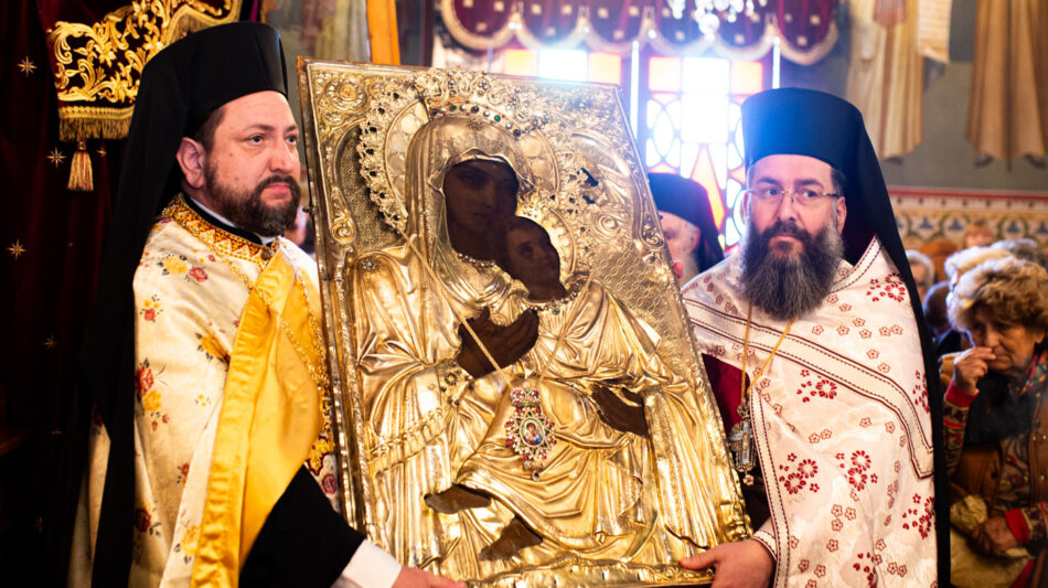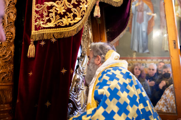 Μετά το πέρας της Θείας Λειτουργίας εψάλη ο Μικρός Παρακλητικός Κανόνας της Θεοτόκου και κατά την ώρα που οι χοροί των ιεροψαλτών έψαλαν το Μεγαλυνάριο της Πολιούχου της Καλαμάτας “Δεύτε την εικόνα Υπαπαντής…” με ρίγη συγκινήσεως οι κληρικοί μετέφεραν την Ιερά Εικόνα της Παναγίας από τον θρόνο της λιτάνευσης στον μόνιμο Θρόνο Της.