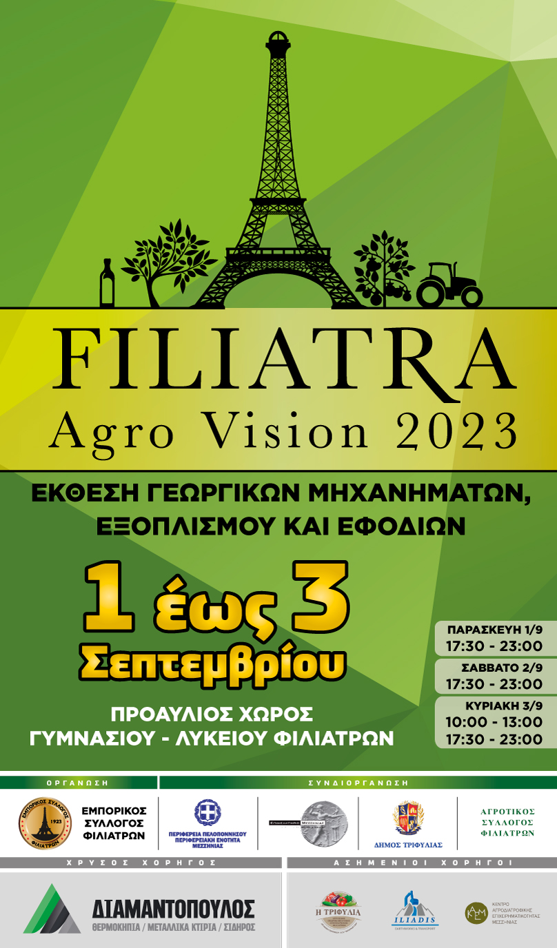 Από 1η έως 3 Σεπτεμβρίου 2023 θα πραγματοποιηθεί στον προαύλιο χώρο Γυμνασίου-Λυκείου Φιλιατρών η 2η Αγροτική έκθεση “Filiatra AgroVision 2023”.