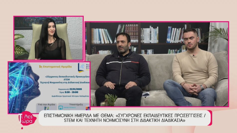 Στην εκπομπή «Τι λες τώρα» με την Αναστασία Μάντζαρη φιλοξενήθηκαν ο Διευθυντής του 24ου Δημοτικού Σχολείου Καλαμάτας, κ. Δημήτρης Βεργόπουλος, και ο εκπαιδευτικός κ. Λάζαρος Ζύλης, καθώς και οι δύο είναι μέλη της οργανωτικής επιτροπής της αυριανής επιστημονικής ημερίδας, την οποία διοργανώνει η Περιφερειακή Διεύθυνση Εκπαίδευσης Πελοποννήσου. Οι καλεσμένοι ανέλυσαν τη σημασία της εκδήλωσης με τίτλο «Σύγχρονες Εκπαιδευτικές Προσεγγίσεις / STEM και Τεχνητή Νοημοσύνη στη Διδακτική Διαδικασία», η οποία θα πραγματοποιηθεί την Παρασκευή 23 Ιανουαρίου στο Αμφιθέατρο του Εργατικού Κέντρου Καλαμάτας. Κατά τη διάρκεια της συζήτησης, τονίστηκε η ανάγκη για διαρκή επιμόρφωση των εκπαιδευτικών στις νέες τεχνολογίες και η ενσωμάτωση της Τεχνητής Νοημοσύνης ως εργαλείο στην τάξη. Η ημερίδα, που τελεί υπό την αιγίδα της Περιφέρειας Πελοποννήσου, αναμένεται να προσελκύσει πλήθος εκπαιδευτικών που επιθυμούν να ενημερωθούν για τις τελευταίες εξελίξεις στην παιδεία.
