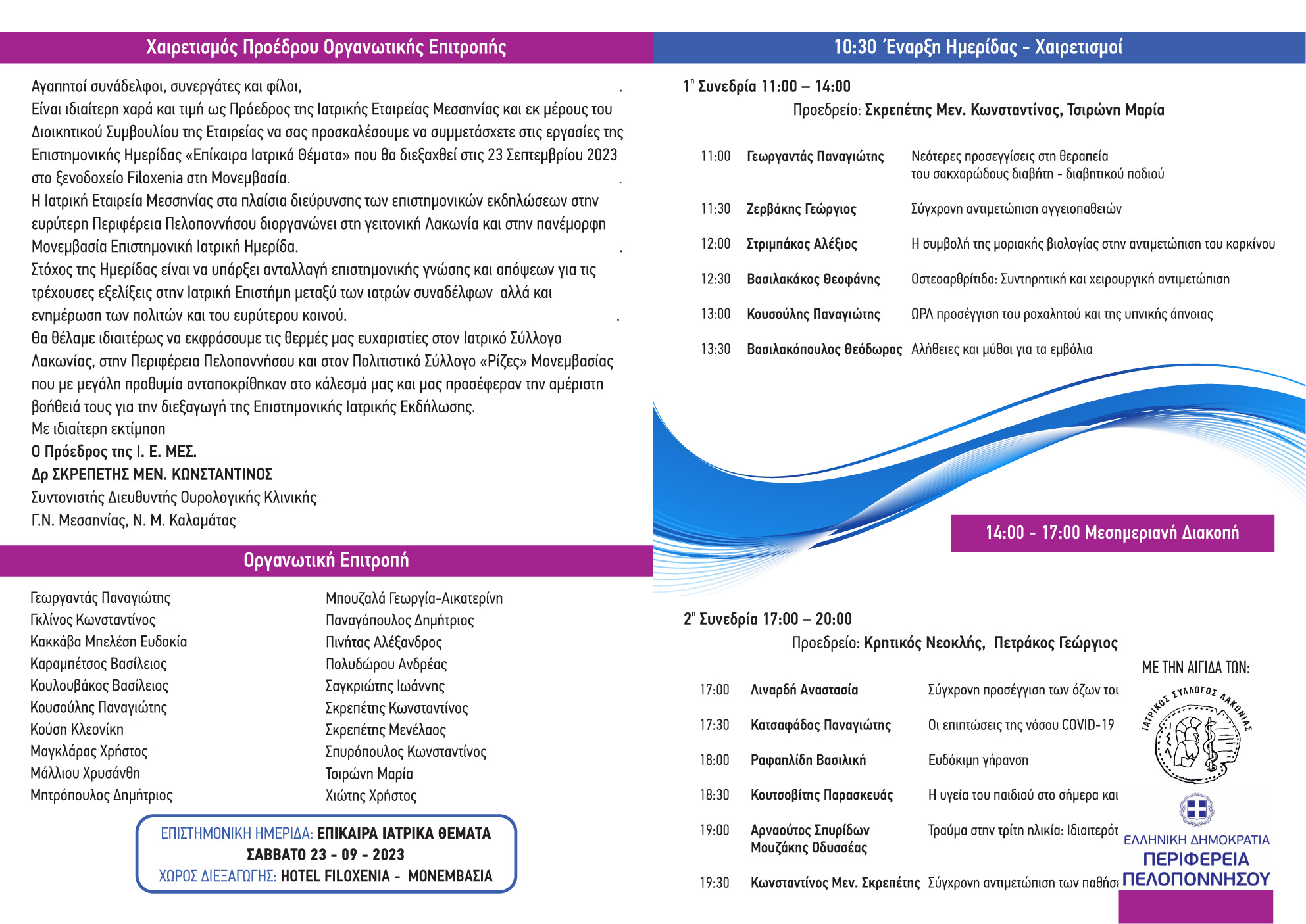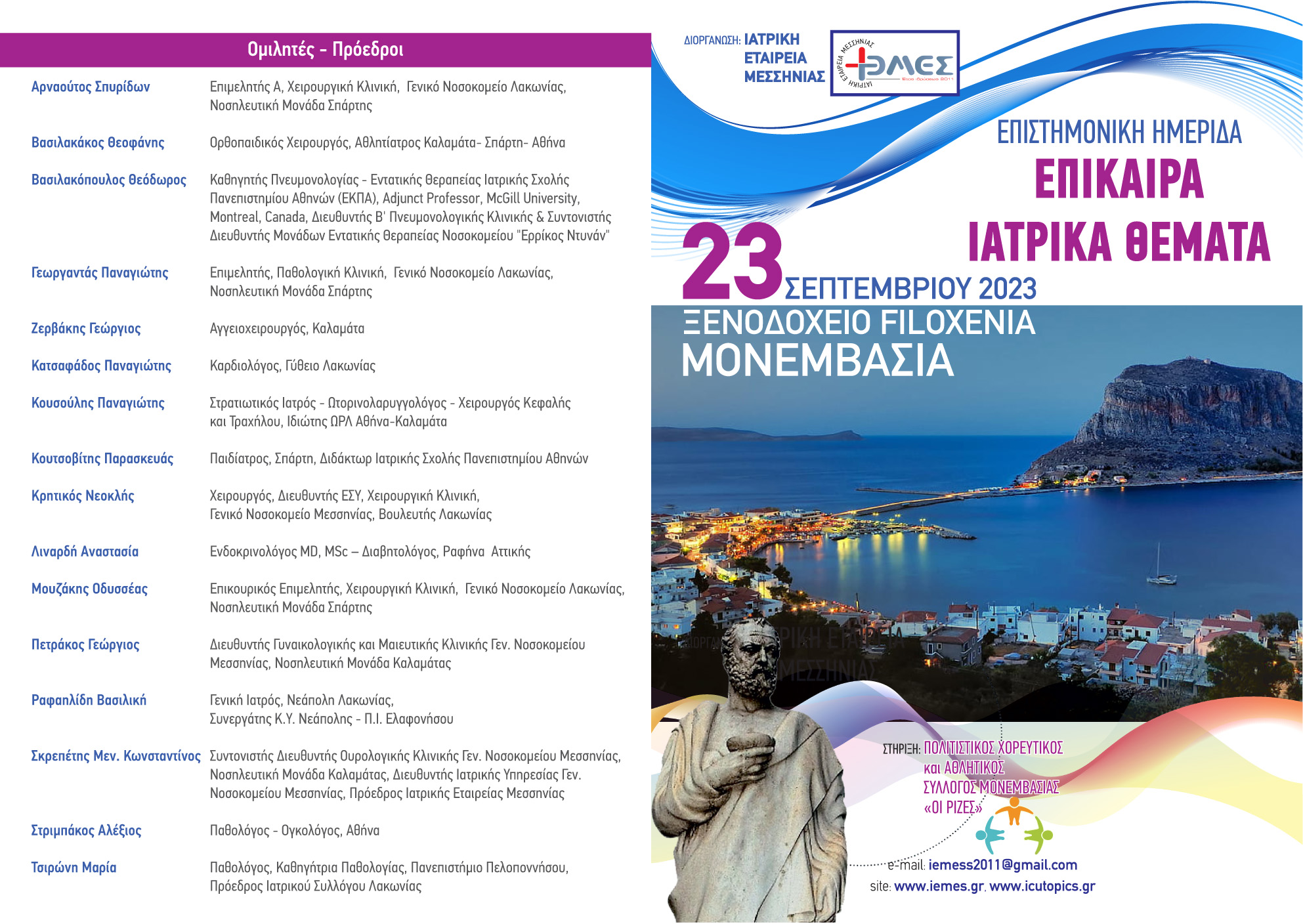 Η Ιατρική Εταιρεία Μεσσηνίας διοργανώνει στην Καλαμάτα στις 23 Σεπτεµβρίου Επιστηµονική Ηµερίδα «Επίκαιρα Ιατρικά Θέµατα», στα πλαίσια διεύρυνσης των επιστηµονικών εκδηλώσεων στην ευρύτερη Περιφέρεια Πελοποννήσου διοργανώνει στην Μονεµβασία.