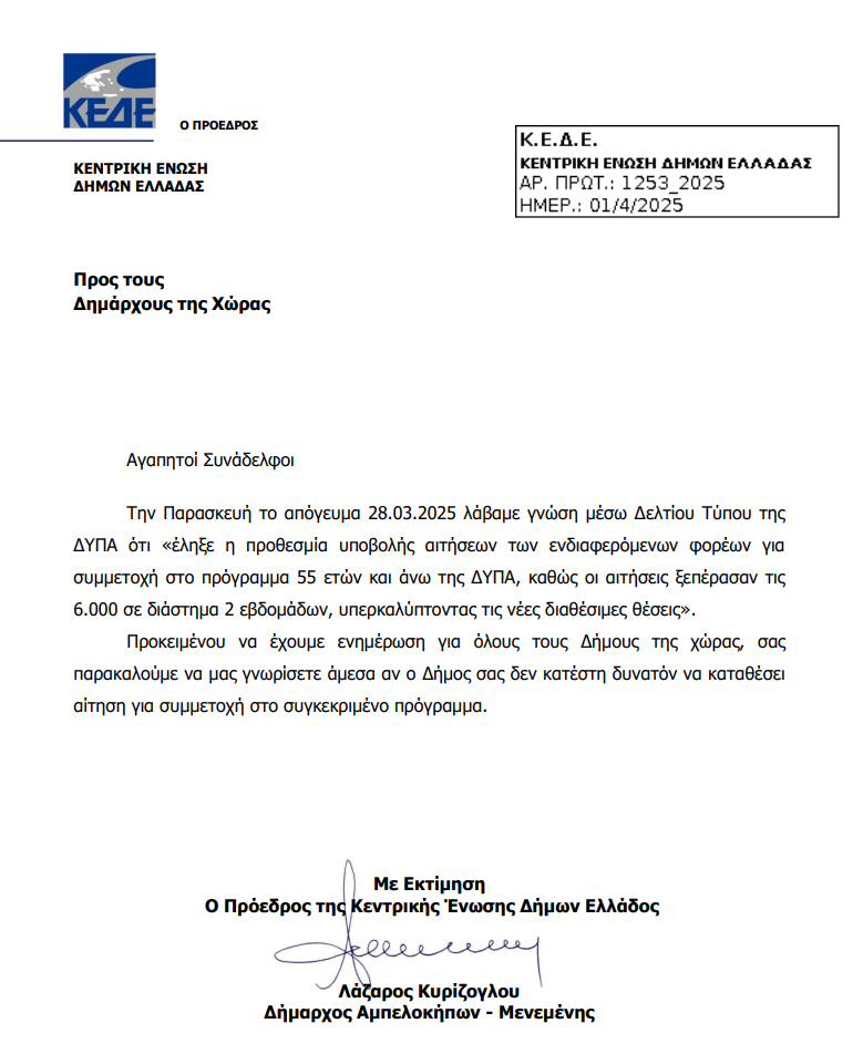 Επιστολή προς τους Δημάρχους όλης της χώρας απέστειλε ο Πρόεδρος της Κεντρικής Ένωσης Δήμων Ελλάδας (ΚΕΔΕ), Λάζαρος Κυρίζογλου, προκειμένου να διαπιστώσει πόσοι από αυτούς παρέμειναν εκτός του προγράμματος απασχόλησης ανέργων ηλικίας 55+ ετών. Ο Πρόεδρος της ΚΕΔΕ εξέφρασε την έντονη δυσαρέσκειά του για τη διαχείριση του προγράμματος από το Υπουργείο Εργασίας και Κοινωνικής Ασφάλισης, κατηγορώντας την Υπουργό Νίκη Κεραμέως και τον Διοικητή της ΔΥΠΑ (Δημόσια Υπηρεσία Απασχόλησης) Σπύρο Πρωτοψάλτη για «κακό σχεδιασμό» και «λάθος χειρισμούς», τονίζοντας ότι το πρόγραμμα έχει αποκλείσει τη συντριπτική πλειοψηφία των δήμων της χώρας.