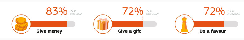 Πάνω από επτά στους δέκα ερωτηθέντες θεωρούν απαράδεκτο να κάνει κάποιος δώρο (72%) ή χάρη (72%) για να πάρει κάτι από μια δημόσια διοίκηση ή υπηρεσία, ενώ το 83% θεωρεί απαράδεκτο να δίνει κάποιος χρήματα για τον ίδιο λόγο.