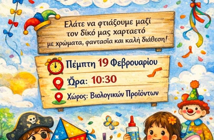 Η Κεντρική Αγορά συνεχίζει τις εξωστρεφείς δράσεις της. Σε αυτό το πλαίσιο, η Κεντρική Αγορά Καλαμάτας καλεί τους μικρούς μας φίλους σε ένα ξεχωριστό δημιουργικό εργαστήριο, την Πέμπτη 19 Φεβρουαρίου 2026 και ώρα 10:30, στον χώρο των Βιολογικών Προϊόντων, για να δημιουργήσουν τους δικούς τους χαρταετούς, γεμίζοντας την ημέρα με χρώμα, φαντασία και χαμόγελα. Παρέχονται όλα τα υλικά.
