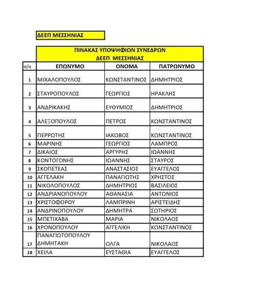 Στην εκλογική περιφέρεια της Μεσσηνίας όλες και όλοι οι υποψήφιοι όλων των αξιωμάτων ανακηρύσσονται ως εκλεγείσες και εκλεγέντες και ως εκ τούτου δεν πραγματοποιήθηκαν εκλογές.