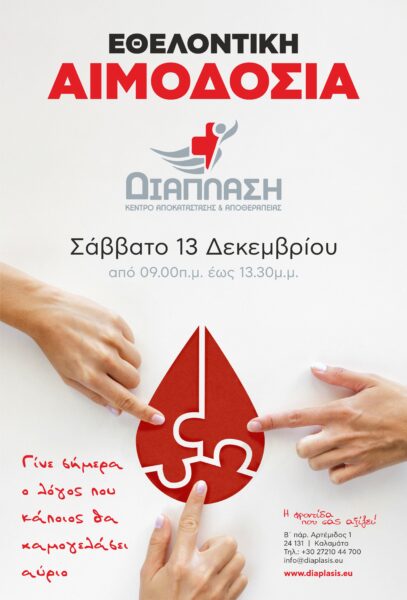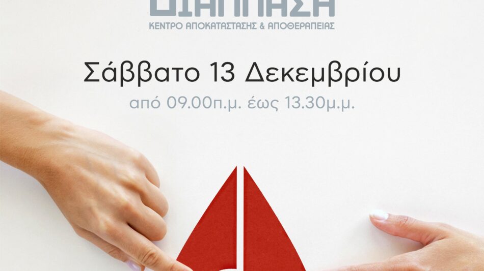 Εθελοντική αιμοδοσία από το Κέντρο Αποκατάστασης & Αποθεραπείας «Διάπλαση» στις 13 Δεκεμβρίου