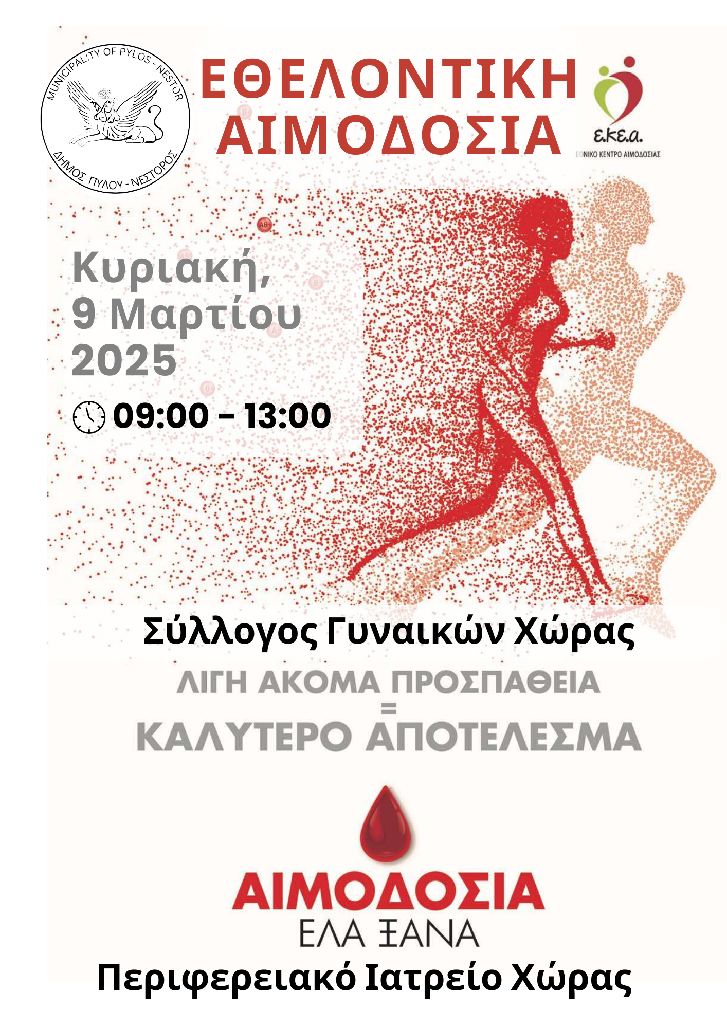 Εθελοντική αιμοδοσία πρόκειται να πραγματοποιηθεί στη Χώρα του δήμου Πύλου Νέστορος, την Κυριακή 9 Μαρτίου. Τη δράση διοργανώνει ο Σύλλογος Γυναικών Χώρας, υπό την αιγίδα του Δήμου Πύλου – Νέστορος, στο Περιφερειακό Ιατρείο Χώρας την Κυριακή 9 Μαρτίου 2025 και ώρες 9 π.μ. – 1 μ.μ.