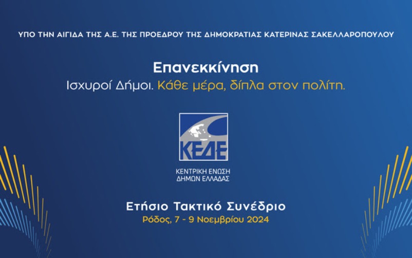 Ξεκινούν αύριο Πέμπτη 7 Νοεμβρίου οι τριήμερες εργασίες του Ετήσιου Τακτικού Συνεδρίου της ΚΕΔΕ στη Ρόδο, υπό την Αιγίδα της Α.Ε. της Προέδρου της Δημοκρατίας Κατερίνας Σακελλαροπούλου, με κεντρικό σύνθημα «Επανεκκίνηση. Ισχυροί Δήμοι. Κάθε μέρα, δίπλα στον πολίτη».