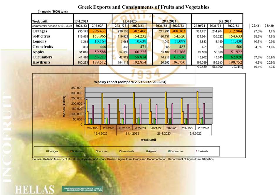Από 1/9/22 έως 5/5/23 οι εξαγωγές πορτοκαλιών ανέρχονται σε 312.984 τόνους (αυξημένες κατά 27,8%) και μανταρινιών σε 154.633 τόνους (αυξημένες κατά 28,5%) έναντι της αντίστοιχης περσινής περιόδου.