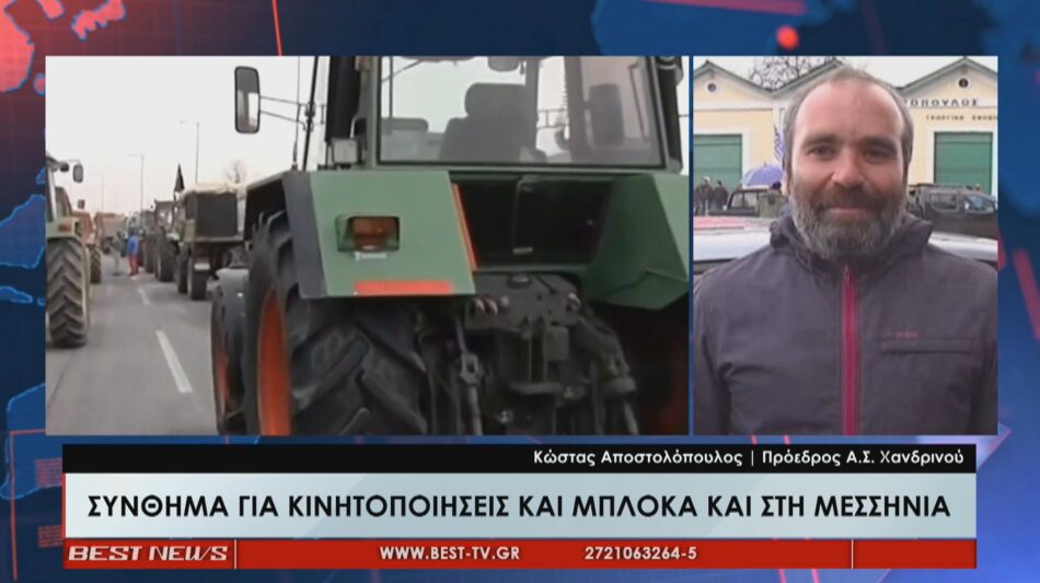 Το σύνθημα δόθηκε από τους αγρότες της Μεσσηνίας για κινητοποιήσεις. Ο Κώστας Αποστολόπουλος Πρόεδρος του Aγροτικού Συλλόγου Χανδρινού μιλώντας στο Κεντρικό Δελτίο Ειδήσεων της τηλεόρασης BEST επεσήμανε «Στη συνέλευση συζητήθηκαν όλα τα προβλήματα τα αιτήματα. Για εμάς η χρονιά εξελίσσεται σε καταστροφική οι ζημιές από δάκο και γλοιοσπόριο είναι μεγάλες. Υπάρχει μόνο ο δρόμος των κινητοποιήσεων. Πρέπει να βγούμε μαζικά στο δρόμο. Οι κατά τόπους αγροτικοί σύλλογοι θα στήσουν ένα μπλόκο στην περιοχή τους θα συσταθούν επιτροπές αγώνα με σκοπό όλοι να συγκεντρωθούν για ένα μεγάλο μπλόκο στη Μεσσηνία. Την Παρασκευή θα υπάρξει κινητοποίηση στη Μεσσήνη».