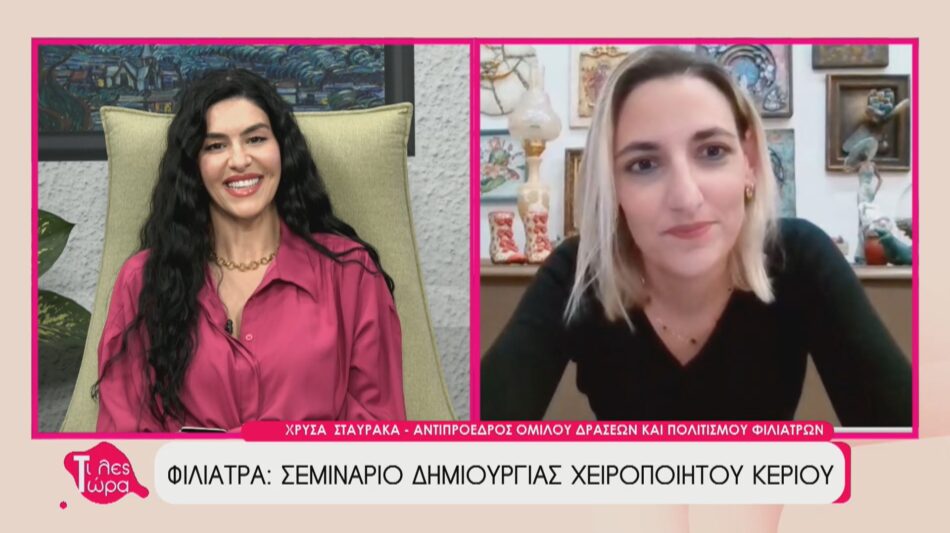 Η Χρύσα Σταύρακα, Αντιπρόεδρος του Ομίλου Δράσεων και Πολιτισμού Φιλιατρών, καλεσμένη στην εκπομπή ”Τι Λες Τώρα” με την Αναστασία Μάντζαρη, μίλησε για το επικείμενο σεμινάριο χειροποίητου κεριού, τονίζοντας τη σημασία των πολιτιστικών δράσεων του Ομίλου. Η Κυρία Σταύρακα προσκάλεσε το κοινό να συμμετάσχει στη δημιουργική αυτή εμπειρία, η οποία αποτελεί μέρος των πρωτοβουλιών του Συλλόγου για την ενίσχυση της τοπικής κοινότητας.