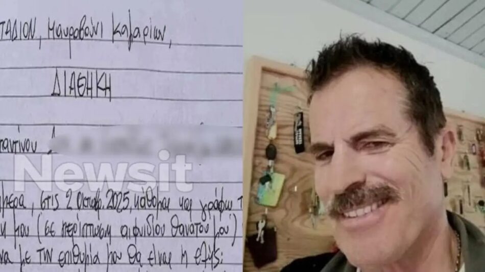 «Σήμερα, στις 2 Οκτωβρίου 2025, κάθομαι και γράφω την διαθήκη μου (σε περίπτωση αιφνιδίου θανάτου μου) και σύμφωνα με την επιθυμία μου, θα είναι η εξής», αναφέρει στις πρώτες σειρές της διαθήκης του ο 68χρονος και στη συνέχεια ορίζει τους κληρονόμους του.
