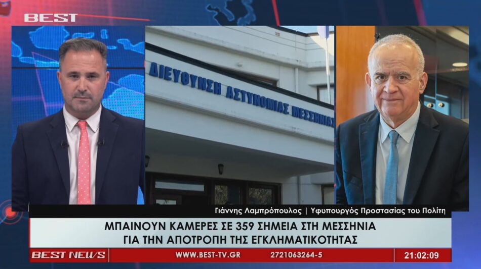 Την τοποθέτηση 359 καμερών σε συγκεκριμένα σημεία της Μεσσηνίας περιλαμβάνει το μνημόνιο συνεργασίας που υπεγράφη από το σύνολο των δήμων του νομού με το Υπουργείο Προστασίας του Πολίτη. Μια πρωτοβουλία που όπως τόνισε ο υφυπουργός Γιάννης Λαμπρόπουλος, με παρέμβασή του στο κεντρικό δελτίο ειδήσεων του BEST θα συμβάλει τόσο στην αποτροπή όσο και στην πάταξη και εξιχνίαση κάθε μορφής εγκληματικών πράξεων. Την ικανοποίησή από το γεγονός ότι «όλοι οι δήμοι αποφάσισαν να ενταχθούν στο σύστημα της επιτήρησης με κάμερες» εξέφρασε ο κ. Λαμπρόπουλος τονίζοντας ότι κάτι ανάλογο «δεν υπάρχει και δεν έχει γίνει σε κανένα νομό της Ελλάδας», ευχαριστώντας και επαινώντας τον δήμαρχο Καλαμάτας που πήρε την πρωτοβουλία, τον δήμαρχο Μεσσήνης και όλους τους υπόλοιπους δημάρχους του νομού που συμμετέχουν στο νέο αυτό μέτρο.