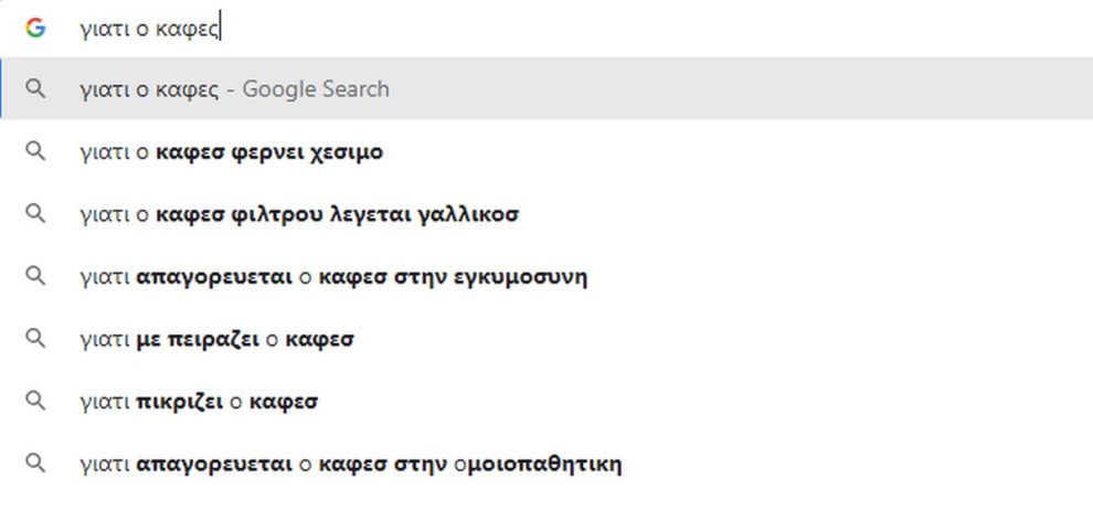 Μεταξύ όσων προσφέρει το Google στην ανθρωπότητα είναι και το τι απασχολεί τους περισσότερους χρήστες, βάσει του αριθμού των σχετικών αναζητήσεων. Ακολουθεί ο πίνακας με όσα ακολουθούν στην ερώτηση που αρχίζει ως “γιατί ο καφές”